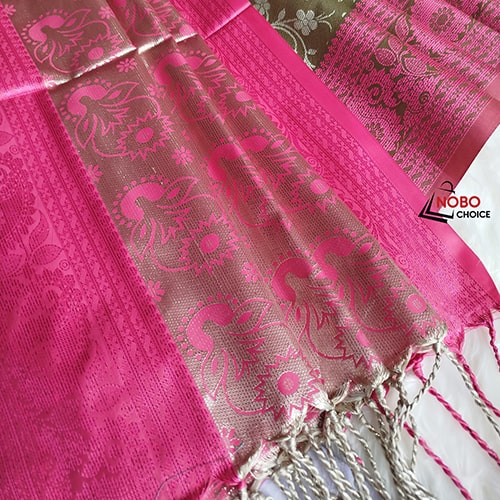 এই ডুয়াল টোন কাতান সিল্ক শাড়িটি তৈরি হয়েছে সূক্ষ্ম নকশা ও ঝলমলে রঙের অনন্য মিশ্রণে। শাড়ির পিংক বডি এবং অলিভ গ্রিন পল্লা একসাথে এনে দিয়েছে এক অনন্য আভিজাত্য। বর্ডারে সূক্ষ্ম ফুলেল ও পেইসলি ডিজাইন শাড়িটিকে করেছে আরও গর্জিয়াস। নরম সিল্ক ফেব্রিকের কারণে পরতে আরামদায়ক এবং হালকা, যা দীর্ঘক্ষণ পরিধানের পরও আরামদায়ক অনুভূতি দেয়। উৎসব, বিয়ে, রিসেপশন বা যেকোনো বিশেষ দিনে আপনার সাজে আনবে রাজকীয় ছোঁয়া।