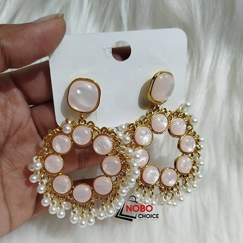 নরম হালকা পিংক রঙের পাথর ও মুক্তার সমন্বয়ে তৈরি এই দুলটি আপনার পার্টি, বিয়ে ও উৎসবের সাজে যোগ করবে এক মিষ্টি ও আভিজাত্যপূর্ণ ছোঁয়া।